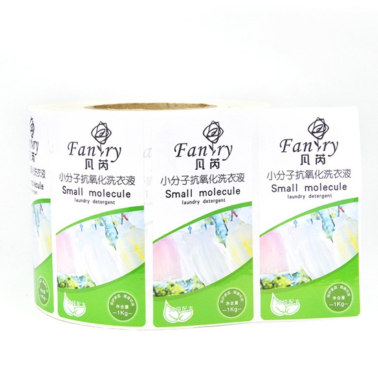 We can do CMYK and PMS color printing on laundry detergent label sticker face stock and then do a thin plastic film lamination on surface.