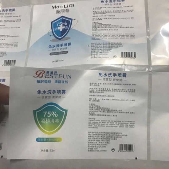 Due to Coronavirus, the demand for disinfectant products is soaring up. Bottled disinfectant shall be available at not only public places, but also private home. Hangzhou Anyvl has been supplying disinfectant products packaging label stickers to local factories for a long time. With rich label design experience and various options for label materials, Hangzhou Anyvl is capable of providing custom printed disinfectant product label sticker solutions for newly built disinfectant factories. For even 500pcs label sticker, we could it for you. Free design support and free face stock materials are offerd to our new clients.